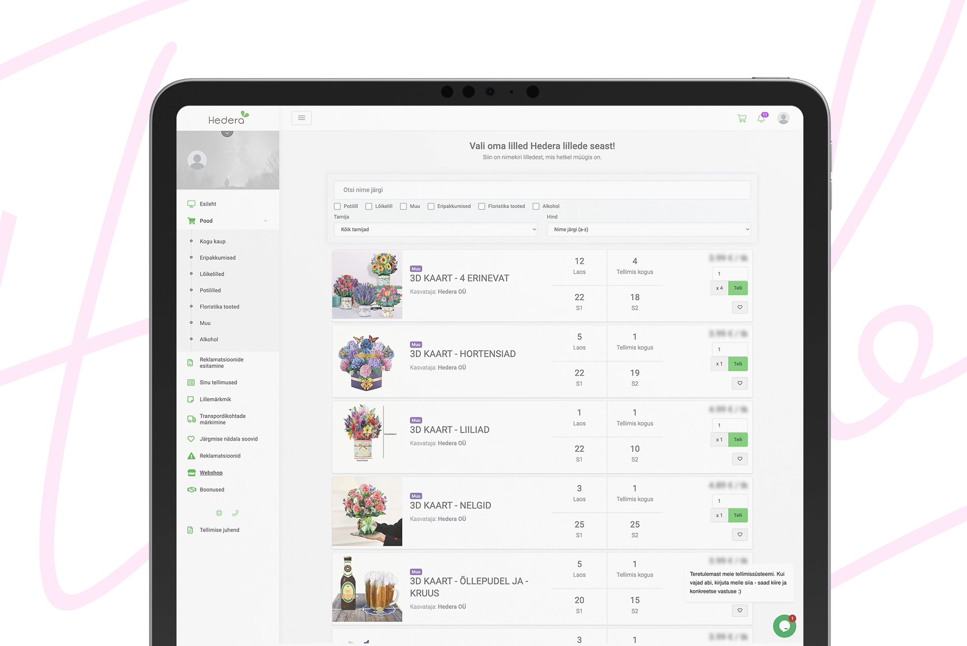 Florabook tellimiskeskkond on lillehulgimüüjale loodud iseteenindus- ja tellimissüsteem, mis võimaldab hulgiklientidel mugavalt ja regulaarselt tellimusi esitada. Lahendus ühendab toodete halduse, tellimisprotsessi, laoarvestuse ja arvelduse ühtsesse digikeskkonda.