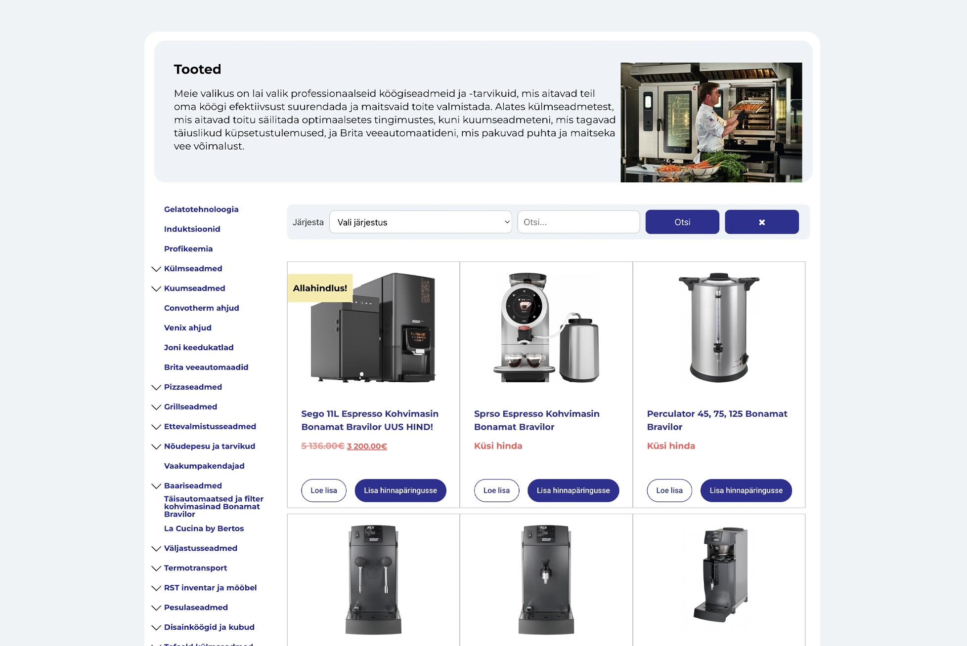 Haktekseadmed OÜ uue veebilehe arendamisel keskendusime professionaalse köögitehnika tootevaliku selgele esitamisele ning lihtsasti hallatava sisulahenduse loomisele. Veebileht ehitati WordPressi ja Elementor Builderi baasil, et klient saaks tulevikus tooteid ja sisu iseseisvalt hallata.
