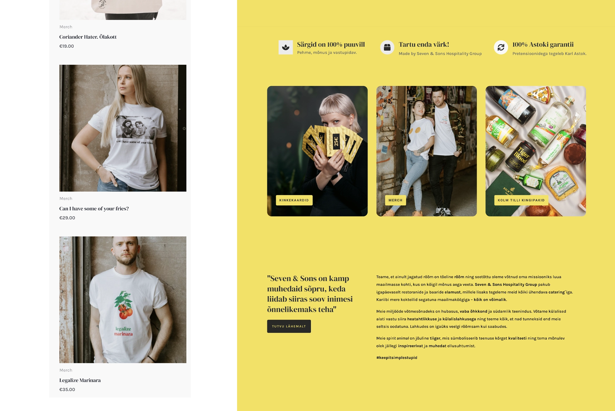 Seven & Sons on restoranide ja baaride grupp, kellel tekkis vajadus oma brändiga seotud merch’i müümiseks veebis. Lõime Seven & Sonsile WordPressi valmisdisainil põhineva e-poe, mis võimaldab kiirelt ja kuluefektiivselt professionaalse müügikanali avamist, säilitades samas brändile sobiva visuaalse taseme.